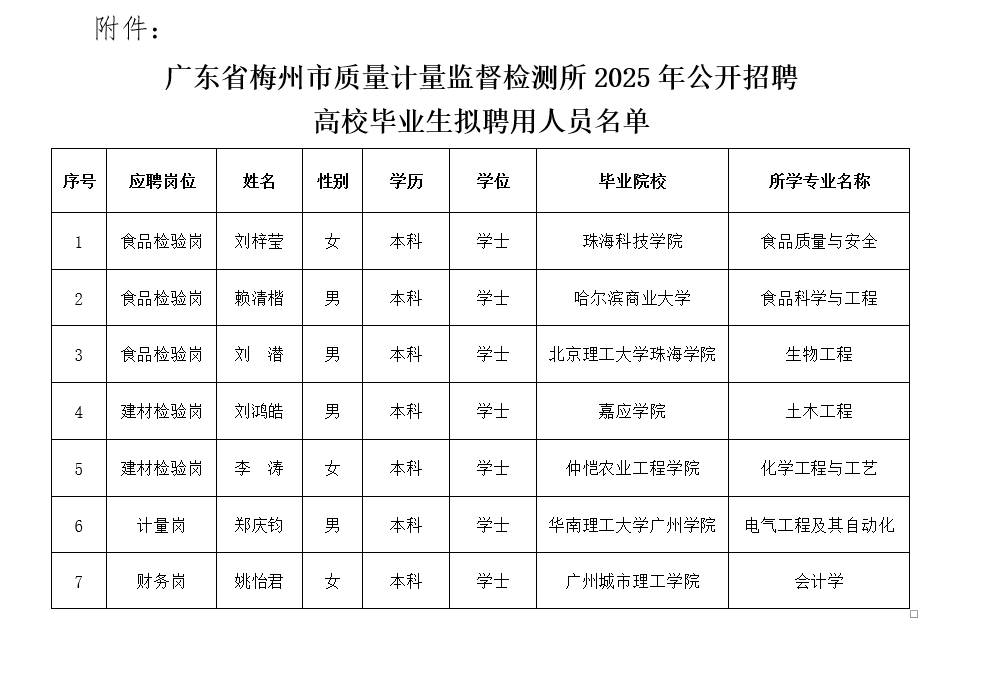 附件:广东省梅州市质量计量监督检测所2025年公开招聘高校毕业生拟聘用人员名单